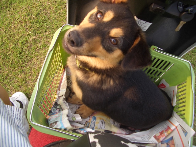 熱心的賣麵老板娘拿了個箱子給我,我整個就跟套圈圈一樣先把狗狗蓋起來。